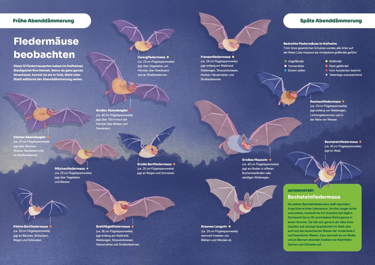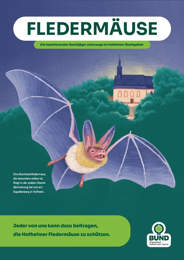 Wenn die Sonne über Hofheim untergeht, werden die Jäger der Nacht aktiv. Um die 12 heimischen Fledermausarten den Einwohnern näher zu bringen, entstand ein mehrteiliger Informationsflyer. Dieser verbindet fundierte Informationen zum Artenschutz mit konkreten Handlungsmöglichkeiten für die Menschen vor Ort.